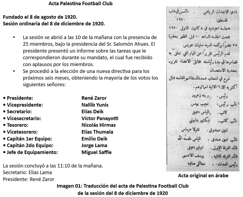 Por otro lado, la prensa de la comunidad árabe en Chile aporta información clave. En el diario Al-Watan se registra una de las primeras sesiones de directorio realizada el 8 de diciembre de 1920 (5), específicamente donde se eligió la primera directiva del club. De acuerdo al enunciado del acta (ver Imagen 01), se deduce que Salomón Ahues actuó como presidente provisorio durante el primer período del club antes de elegir a la nueva directiva para los próximos 6 meses.