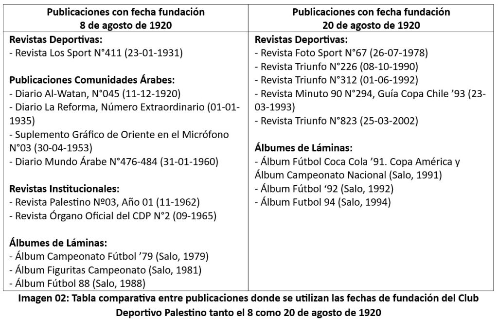 A falta de un hito o hecho en concreto que indique un cambio en la fecha de fundación, se hizo una revisión detallada de las publicaciones más relevantes que indiquen una fecha de fundación, tanto deportivas, de comunidades árabes, revistas institucionales y álbumes de láminas, lo cual se refleja en la siguiente tabla comparativa en la Imagen 02.