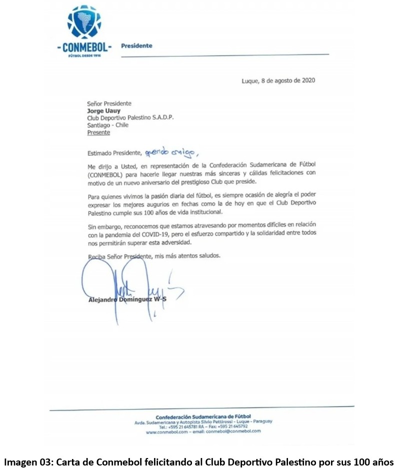 Otro detalle curioso es que, aunque no suma a nivel histórico, al menos llama la atención. Para el aniversario de los 100 años del equipo, se recibió una carta firmada por Alejandro Domínguez (ver Imagen 03), presidente de Confederación Sudamericana de Fútbol en aquel momento, quien felicitó al equipo por el aniversario de los 100 años de la institución, con una carta fechada ni más ni menos que el 8 de agosto de 2020. (15)